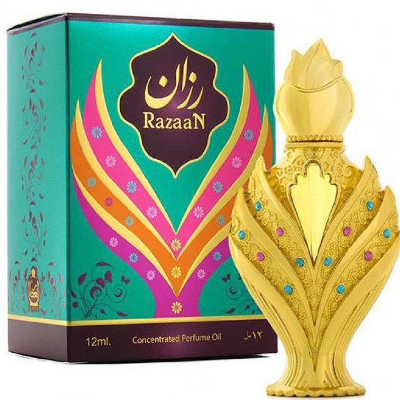 Концентрированные духи на масляной основе Razaan не содержат в своём составе спирта. Роскошный позолоченный флакон оформлен в соответствии с многовековыми восточными традициями. Он напоминает распустившийся бутон цветка с разноцветными вкраплениями-бусинами на лепестках. Удивительный дизайн сосуда словно намекает на цветочную составляющую парфюмерного букета, смешанную с цитрусовыми капельками. Звучание нежного аромата цветов улавливается с первых минут после нанесения на кожу. Он становится главным компонентом парфюма, а в сердце разбавляется насыщенными горьковатыми оттенками свежей зелени и травы. Зелёный запах освежает цветочные акценты, раскрывает их в полную силу и прекрасно дополняется бодрящей горчинкой ярких цитрусовых аккордов. Аромат становится энергичным и полностью соответствует знойной летней погоде. В шлейфе он играет новыми красками на фоне мягкой чувственности мускуса. Компонент отлично подчёркивает фруктово-цветочную композицию.