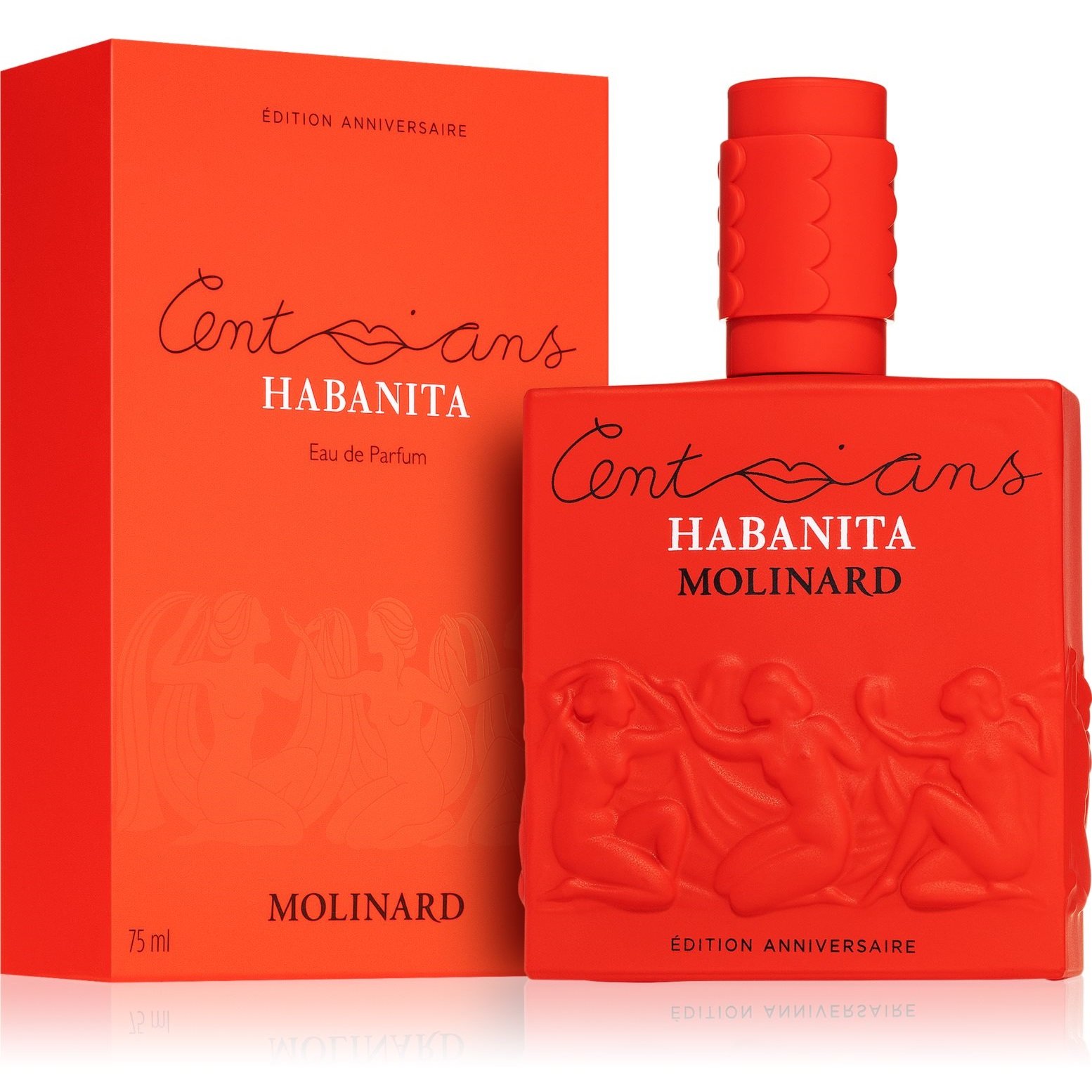 По случаю 100-летнего юбилея Habanita, Molinard отмечает сладострастный, чувственный и завораживающий характер своего легендарного аромата, облачая свой великолепный флакон в красное платье Habanita! Флакон сохранил свою обычную форму, украшенную фризом наяд, вдохновленный творчеством Рене Лалика, с плотскими рельефами и чувственными изгибами обнаженных женщин. Habanita предлагает новое лицо, сохраняя при этом самое главное: силу, густоту, поэзию, оригинальные ноты, не имеющие сходства. Новое облачение более сдержанное и радикальное: элегантное, современное, темное и мягкое одновременно. В оформлении использован фриз от Lalique, специально разработанный для Habanita, черно-красное приглашение к открытию и новому обретению.