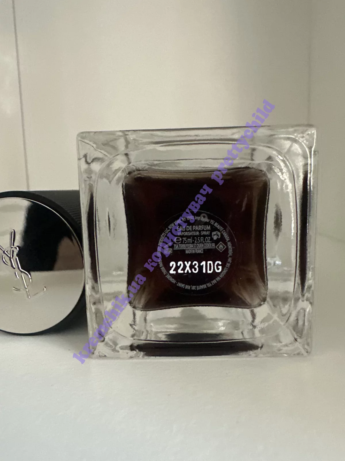 Крышка украшена серебряной пластиной с вырезанным фирменным логотипом Cassandra. В игре матового и блестящего покрытия текстура кепки отражает культовую ткань для смокинга Yves Saint Laurent: «grain de poudre». Название аромата обрамлено квадратной серебристой окантовкой, на которой изображены два основных драгоценных ингредиента. Толстое стеклянное дно создает множественные геометрические отражения, усиливая архитектурную чистоту, подчеркивая утонченный и очень желанный кутюрный пестрый серый цвет жидкости».