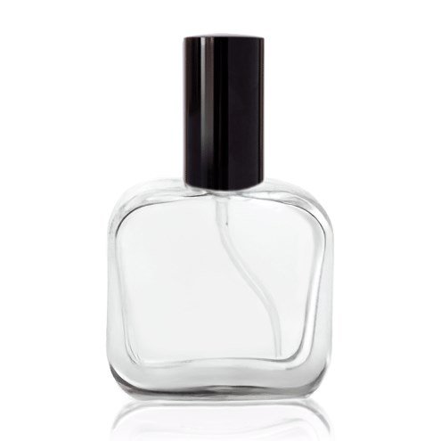 Стеклянный тонкий флакон прямоугольной формы объемом 20 мл с металлическим распылителем разных цветов.
