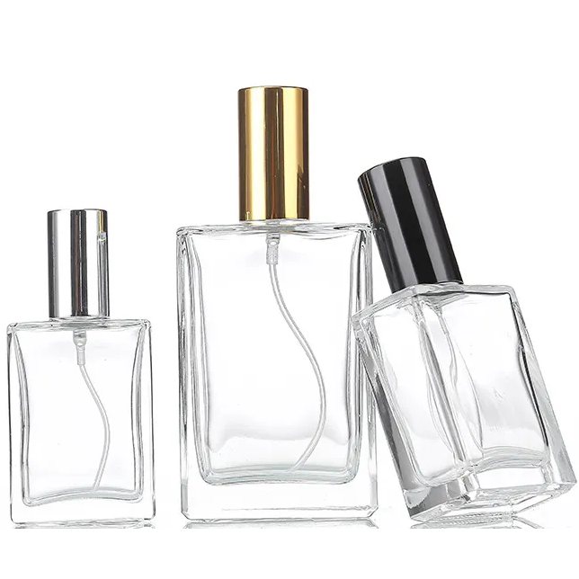 Стеклянный флакон прямоугольной формы, с металлическим распылителем разных цветов объемом 100 мл