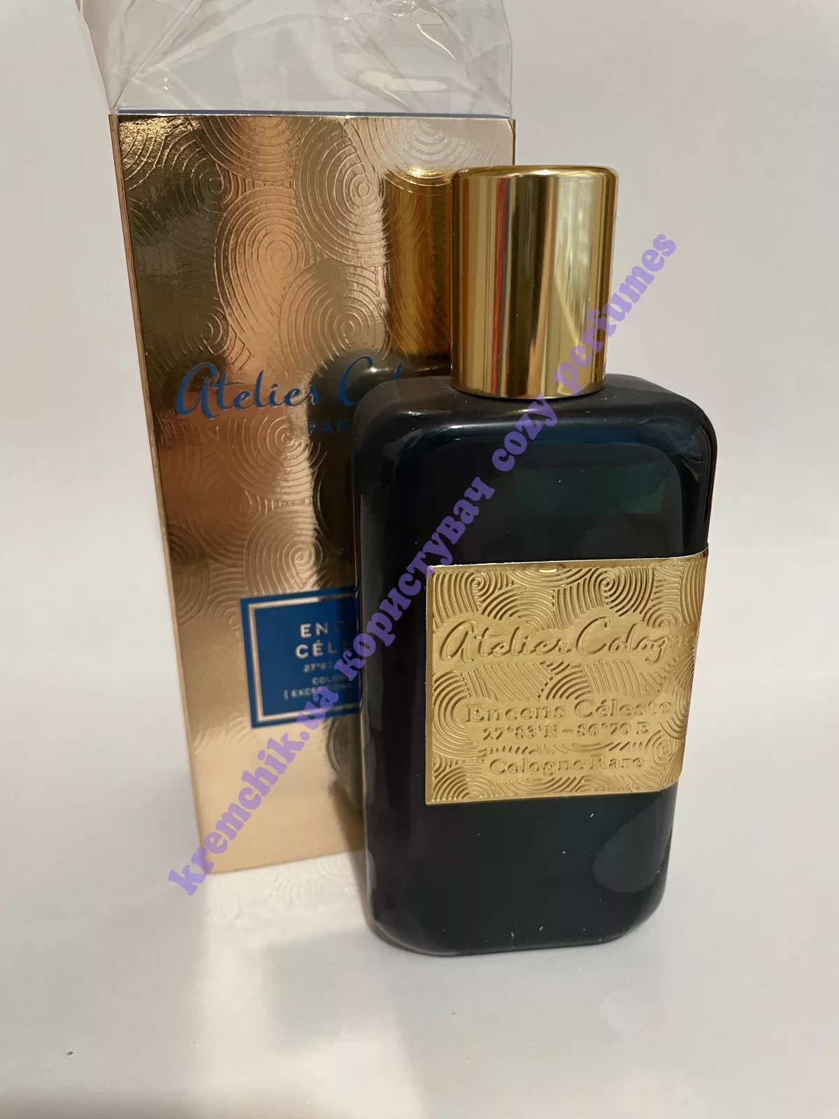 "На заснеженной горе поднимается к небу таинственный дым. Тонко пахнущий, но раскаленный священный ладан рассеивает все внутренние тревоги. Что касается композиции, то включение ладана в качестве средней ноты в Encens Celeste занимает центральное место в легендарном статусе среди элитных ароматов благодаря экзотическому происхождению. Он создает уникальное ощущение тепла, поскольку процесс сбора смолы ладана очень скрупулезный, поскольку выбираются только идеальные смолы. После этого извлекается чистейшее эфирное масло ладана благодаря технологии экстракции углекислым газом, а также длительной и низкотемпературной, сохраняя при этом все свои природные свойства" — официальный релиз Atelier Cologne.