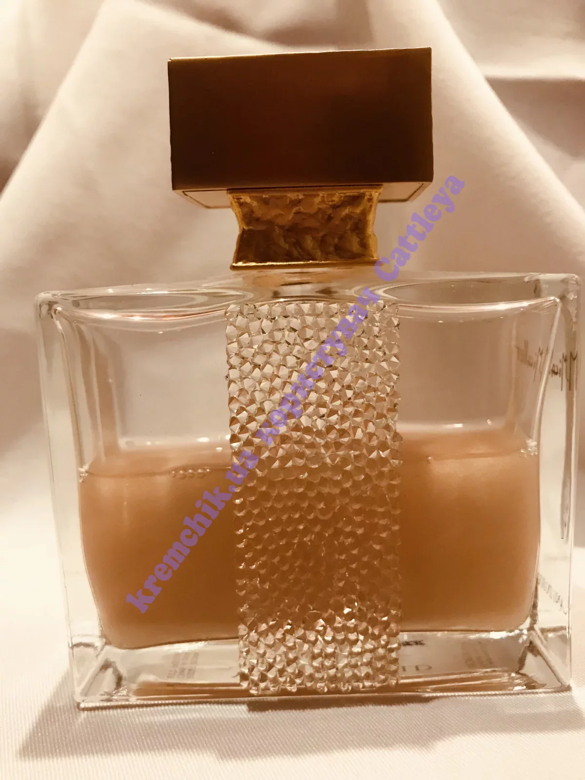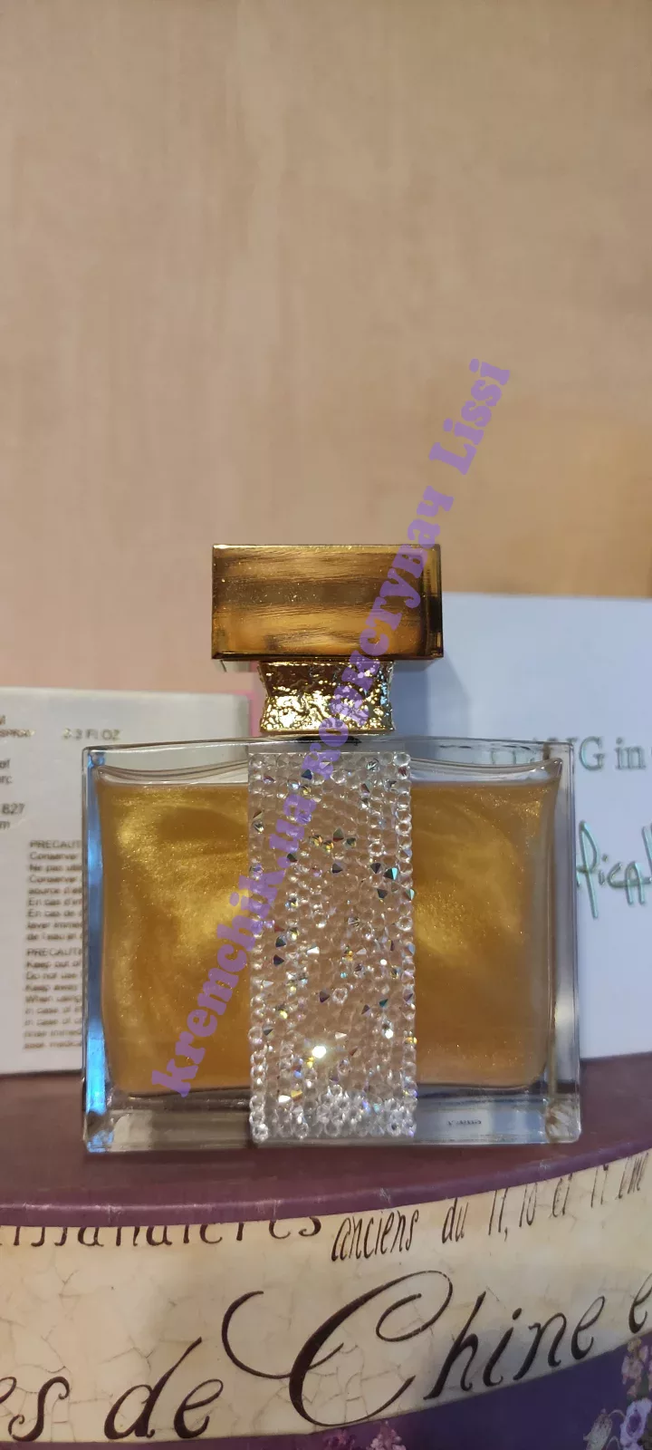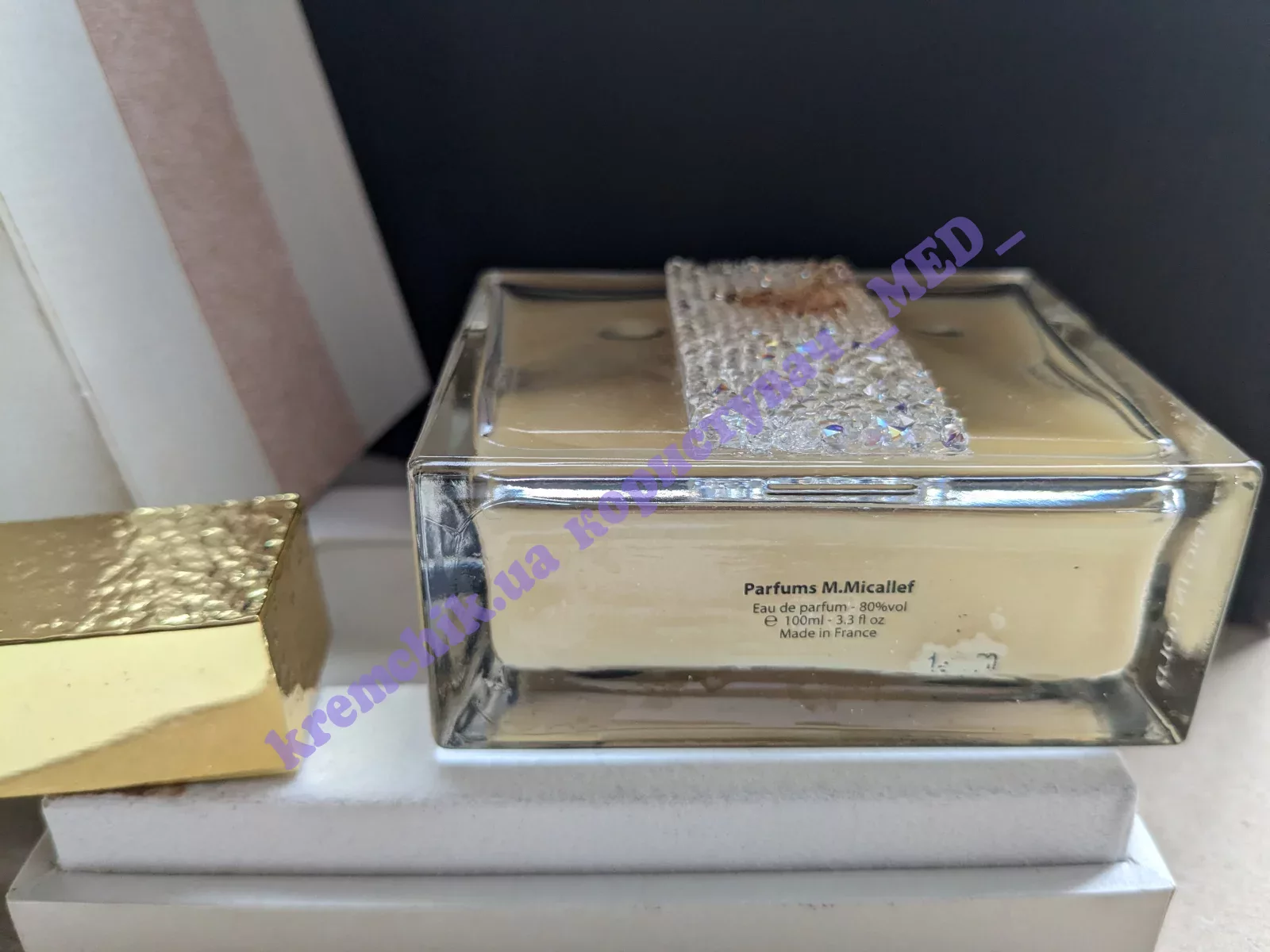Сам флакончик декорирован вручную камнями Сваровски, изготовленными по специальному заказу для Мартины Микаллеф.