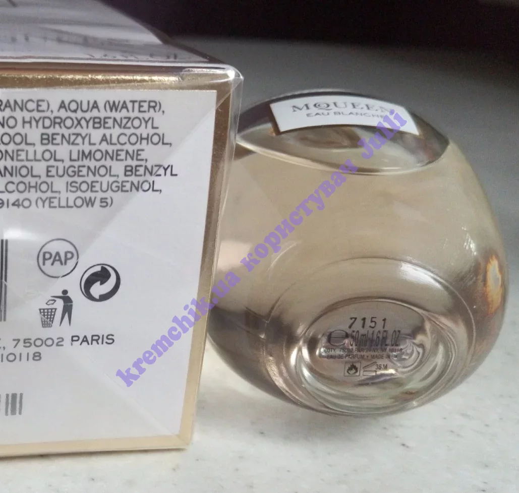 McQueen Eau Blanche доступен в объеме флаконов 50 и 75 мл в концентрации парфюмированной воды.