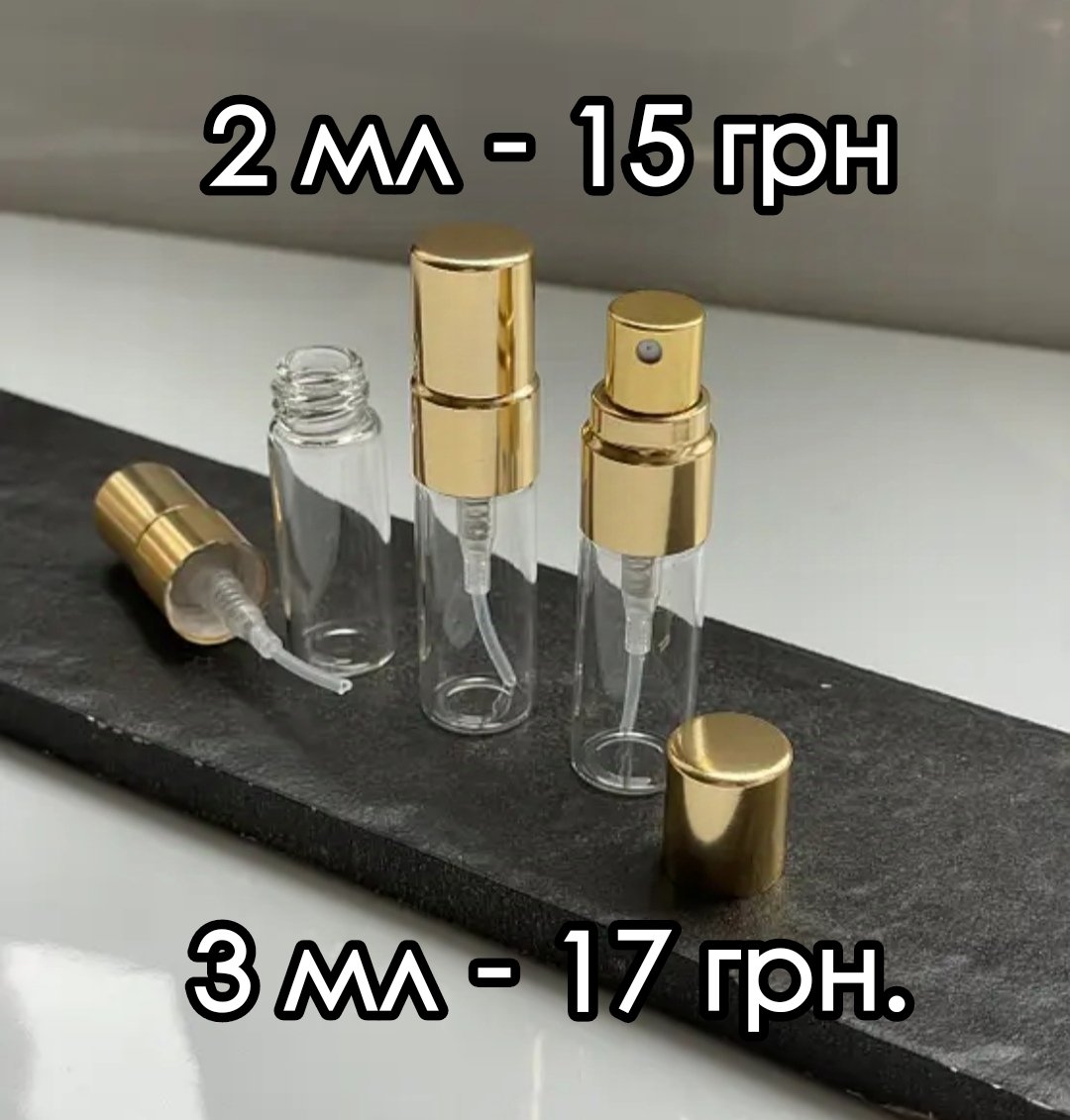 - Флакони: скло з металевим розпилювачем від 2 мл та пробник на 1 мл.